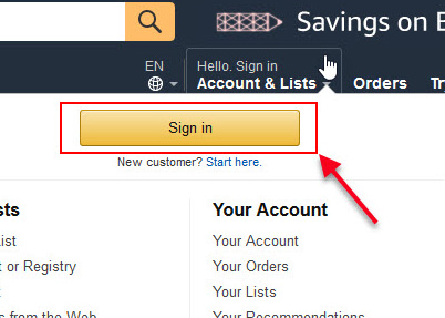 سپس مطابق تصویر از منوی سایت گزینه Account and Lists را انتخاب کنید ، سپس گزینه Sign In را کلیک کنید .
