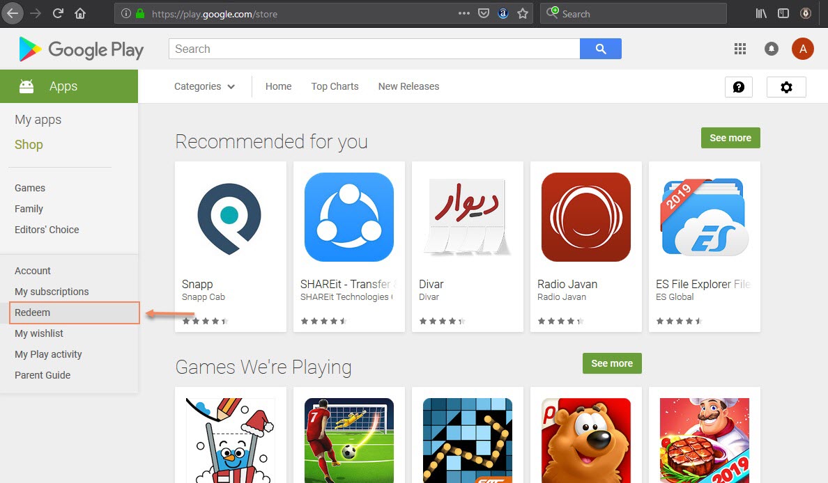 مطابق تصویر ، در این مرحله از منوی سمت چپ گرینه Redeem را انتخاب کنید .
