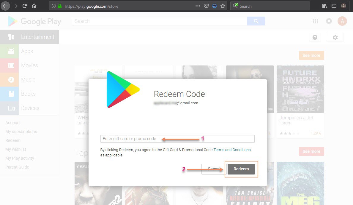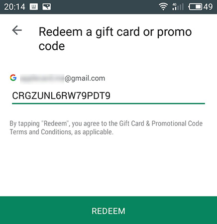 کد گیفت کارت گوگل پلی را بصورت کامل و صحیح و بدون کاراکتر اضافه در کادر مشخص شده وارد نمایید و سپس بر روی گزینه ی Redeem کلیک نمایید .