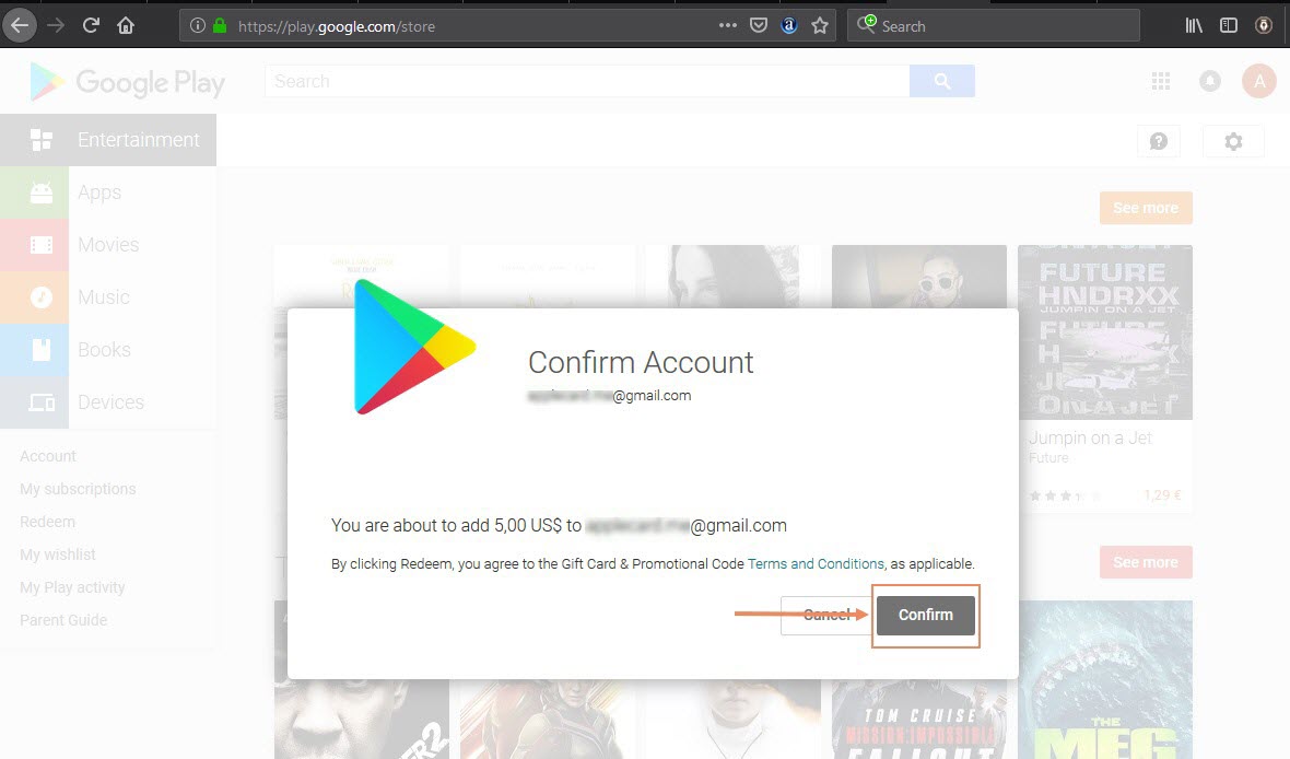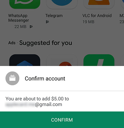 در صورتی که مبلغ و اکانت ، مورد تایید شما است روی گزینه Confirm کلیک کنید تا مبلغ به حساب gmail شما افزوده شود .