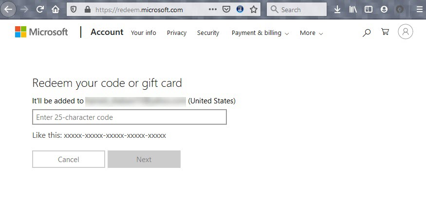 در فیلد مربوطه کد 25 کاراکتری گیفت کارت ایکس باکس یا ماکروسافت خود را وارد کنید و گزینه Next را کلیک کنید تا اکانت شما شارژ شود.